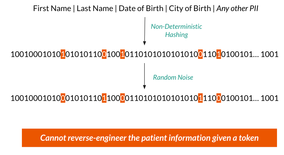 CuresDev has developed a novel tokenization technology that first converts patient information into a 1000 length string of zeroes and ones. We use a non-deterministic hashing technology called Bloom Filters to generate the string. In order to preserve privacy, we randomly mutate about 5% to 15% of the bits. Every time the tokenization process is run, it produces a different token for the same patient. This ensures the tokens cannot be reversed back to the original patient information.